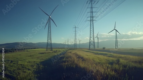 scenic, view, wind, power, line, extending, toward, horizon, energy, electricity, turbine, sky, generator, windmill, field, environment, electric, alternative, blue, landscape, green, tower, technology, industry, farm, wind turbine, road, cable, voltage, renewable, pylon