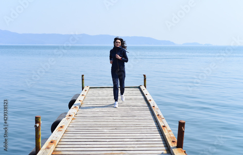 45 y.o. Russian woman running on a wooden pier by the Japanese sea