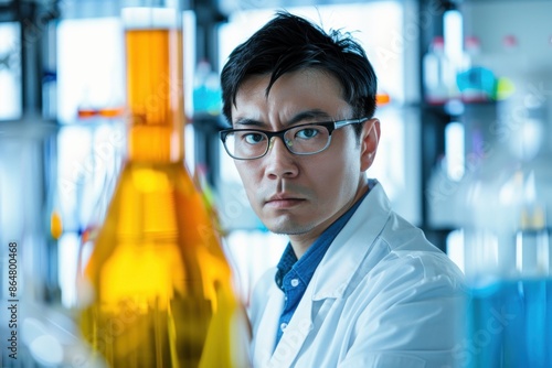 47. Portrait of an Asian quality assurance manager supervising lab tests, high detail, photorealistic, serious expression, bright lab