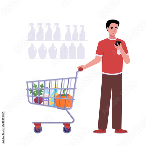 man, shopping, grocery, store, cart, full, vegetable, looking, supermarket, retail, phone, illustration, vector, cartoon, young, food, buying, character, streetcar, market, male, person, sale, product, buyer, client, purchase, basket, design, shopper, shelf, lifestyle, consumerism, background, human, protection, infection, consumer, walking, happy, beauty, attractive, mall, pandemic, choice, flat, art, client, produce