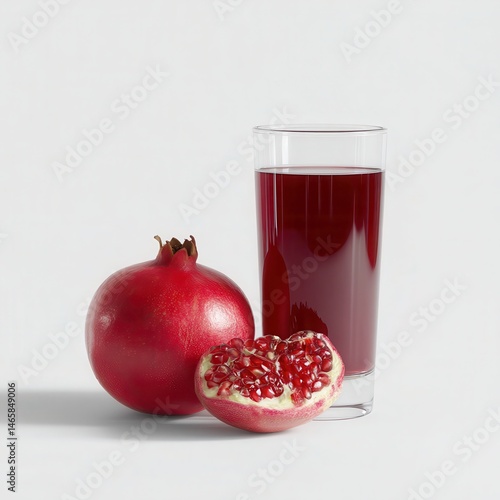 4K photograph in a clean white studio featuring a pomegranite and a full glass of pomegraite juice. White back drop --profile u38z5ol.