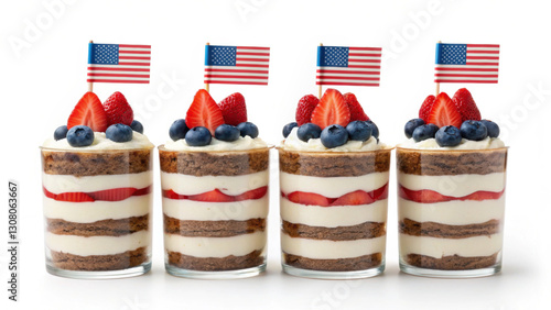 4th of July dessert. Patriotic desserts with layers of cream, berries, and small American flags.