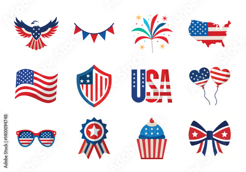 july, vector, element, set, collection, american, independence, day, illustration, white, background, design, patriotic, flag, star, stripes, celebration, holiday, freedom, us, united, state, america, red, blue, fireworks, party, decoration, banner, poster, theme, symbol, tradition, national, history, culture, heritage, festival, summer, event, graphic, art, creative, clip, drawing, icon, emblem