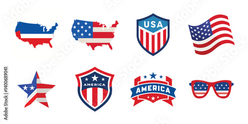 4th of July vector elements set. Collection of American Independence Day vectors, shield, banner, hat, sunglass, map collection