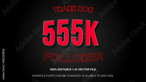 555 k followers celebration horizontal vector banner. Social media achievement poster. 555 K followers thank you lettering. Editable text style Effect. celebration subscribers. Vector illustration
