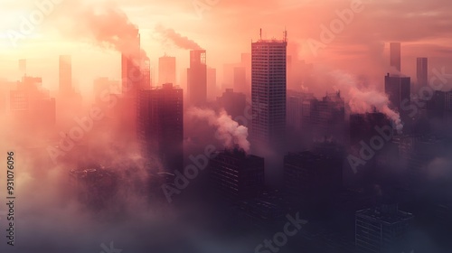 eerie, city landscape, toxic, fog, rolling, industrial, area