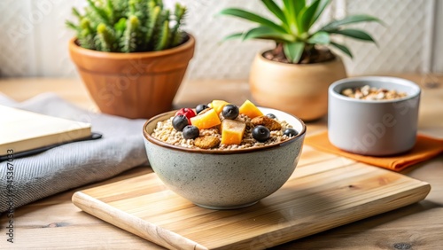 8. A small ceramic bowl filled with muesli with chia seeds and dried fruits, placed on a bedside table with a few Healthy Living books and a small potted plant nearby, a realistic photo image.