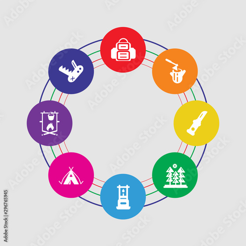 8 colorful round icons set included swiss army knife, bonfire, tent, gas, pines, knife, axe, backpack