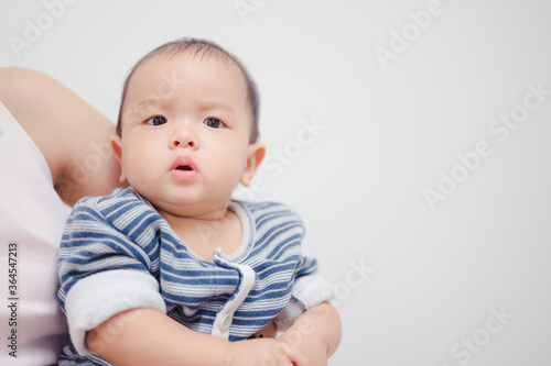 8 months baby boy portrait, asian kid face, little boy looking at camera