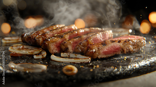steak, onion, meat, juicy, sizzle, hot, stone, aromatic, create, mouth, water, roast, art, deliciously, shadow, favor, luxury, eat, cook, bar-b-q, savoury, elegance, stylish, tasty, marble, dinner, smoke, herb, epicure, tender, garnish, indulgence, saute, surface, beef, background, bar-b-q, table, texture, aroma, lunch, closeup, receipe, season, upscale, cut, cookery, fresh