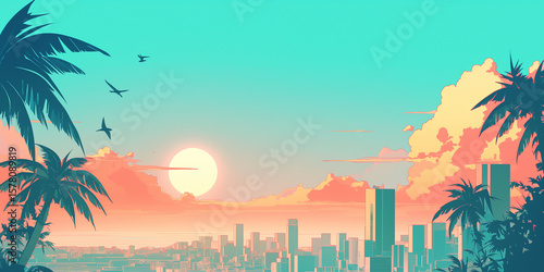 80年代シティポップ風の色調で描かれた高層ビルとの街並みイラスト素材|昭和レトロ、ネオン街、手描き風、都会、アーバンライフ、ポップ、懐かしい
