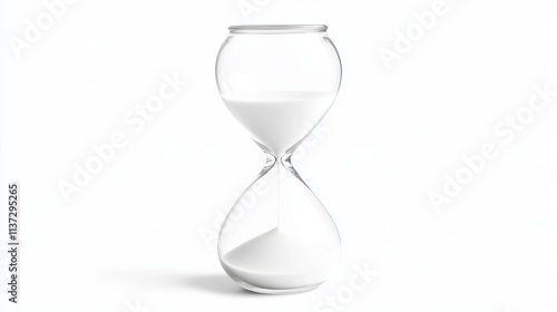 81.Crisp image of a minimalist hourglass with fine sand gently falling through its center, set against a bright white backdrop; high-resolution details capture the clarity of the glass and the even