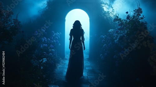 mysterious, woman, silhouetted, shadow, walk, through, misty, night, garden, surrounded, delicate, flower, glow, archway, illuminated, aethereal, neon, blue, light, dark, luxurious, dress, catches, portal, back, turned, enchanting, aura, magic