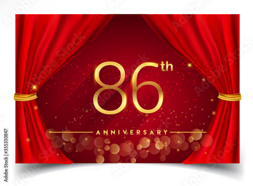 86th years golden anniversary logo with glowing golden colors isolated on realistic red curtain, vector design for greeting card, poster and invitation card