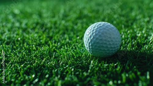 8k close-up of a golf ball on vivid green turf, highlighting the detailed texture of the ball and the sharp blades of grass, ideal