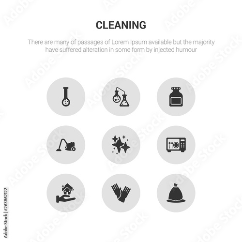 9 round vector icons such as trash bag, sanitize, clean-living, sterilization, neat contains hoover, acid, chemical reaction, hard water. trash bag, sanitize, icon3_, gray cleaning icons