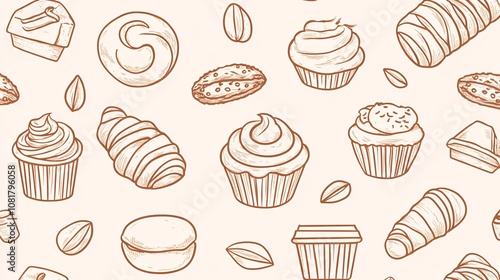 collection, bakery, hot drink, icon, drawn, hand, clean, simple, line, arranged, geometric, background, pattern, soft, minimalist, design, croissant, muffin, cup, ideal, cafes, or, setting