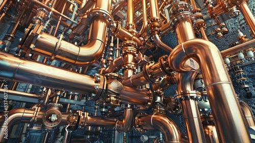 A complex network of copper pipelines and valves in a large buildinga??s heating system, showcasing the intricacy and engineering expertise required.