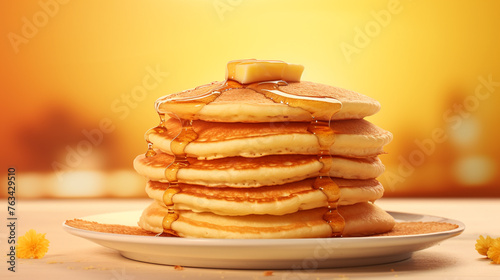 A image of a stack of fluffy pancakes on a sunny yellow background.
