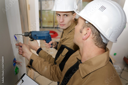apprentice, a, wall, with, his, mentor, fuse, profession, fixing, training, student, colleague, apprenticeship, man, repairing, employee, concentrated, power, device, occupation, work, renovation, construction, switch, helmet, background, professional, electric, technician, safety, belt, building, tile, drill, glove