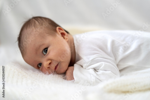 baby, children, newborn, bed, bedchamber, girl, cute, smiling, happiness, closeup, cot, caucasian, lying, cosy, human face, serene, white, home, indoor, month, peacefully, one person, people, family, female, babyhood, front view, relaxation, resting, half face, lying down, comfortable, curiosity