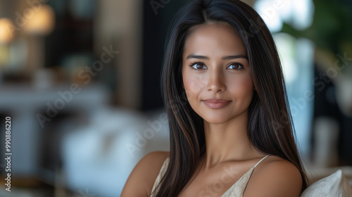 A 35-year-old Mexican woman with long, dark, straight hair, tanned skin and brown eyes, wearing an elegant designer dress. She looks confident and successful, in a luxurious setting