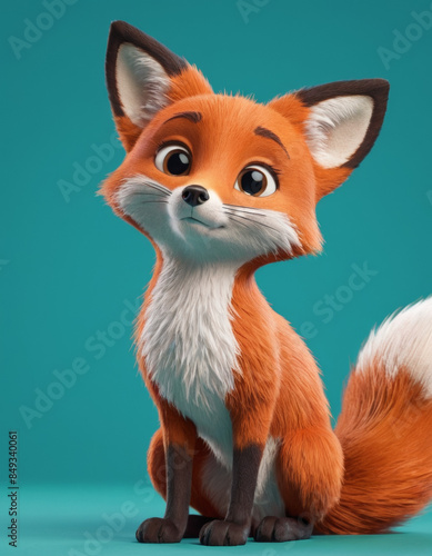A 3D cartoon fox with a bushy tail and a curious look on a teal background.