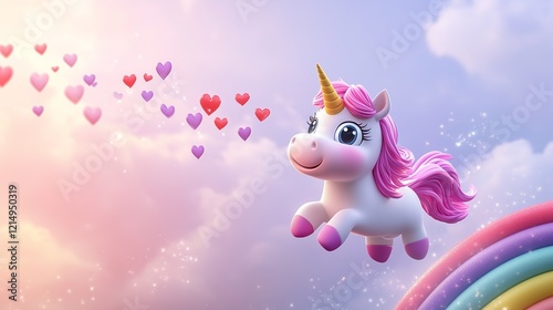 A 3D cartoon unicorn flying over a rainbow, leaving a trail of heart-shaped sparkles in the sky.