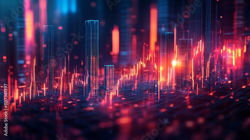 financial, graph, building, city, skyline, neon, metallic, texture, glowing, light, futuristic, urban, cinematic, depth, dynamic, perspective, finance, economy, innovation, skyscraper, vibrant, illuminated, modern