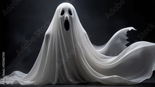 A 3D floating ghost with torn edges, hollow eyes, and an open mouth. Semi-transparent white fabric, perfect for spooky Halloween designs. Solid black background