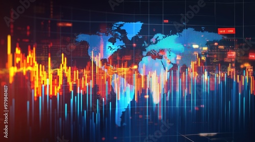 A 3D graph of global economic growth, with country flags and stock market indicators rising above a world map background