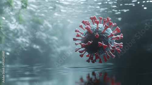 A 3d model of a virus particle floating in water with clear reflections and a soft, blurred background creating a surreal atmosphere