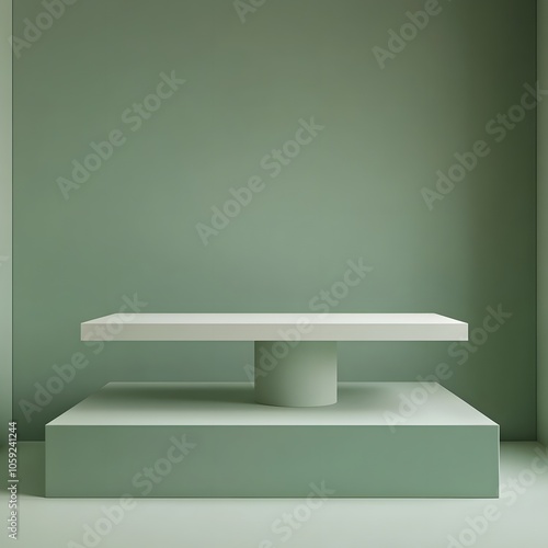 A 3D podium white rectangular table is balanced on the edge of an angled green platform, in a minimalist style, with a solid color background, studio lighting, soft light, delicate texture, high satu