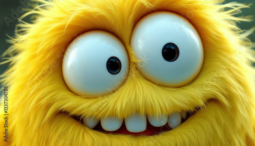 A 3D render of a fluffy yellow monster with big eyes and a toothy grin, the monster is round and covered in soft
