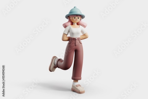 A 3D render of a stylish cartoon girl with pink hair, wearing a bucket hat, white shirt and brown pants, posing playfully.