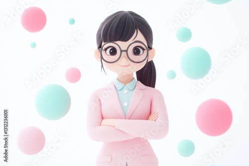 A 3D rendered illustration of a confident young woman with glasses, standing with her arms crossed against a background of pastel-colored spheres.