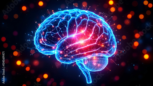 A 3D rendering of a human brain with glowing blue and red lines and dots, representing connections. The background features blurred orange and red lights, creating a futuristic and abstract feel.