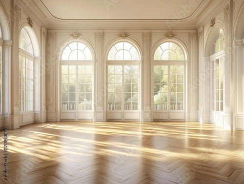 A 3D rendering of an empty room with parquet flooring and large windows provides a serene and spacious backdrop for a variety of design and architectural concepts in stock photography