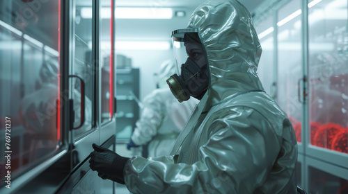 A 3D visualization of a researcher in a biosafety level 4 lab dressed in a full protective suit