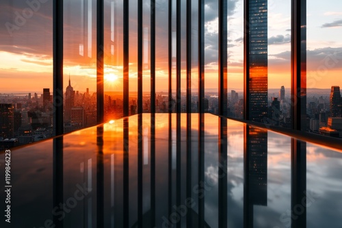 A 3D-rendered depiction of a modern skyscraper with floor-to-ceiling windows, reflecting a dazzling cityscape with the sun setting in the background