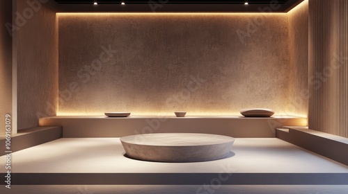 A 3D-rendered exhibition background featuring smooth surfaces and soft lighting, ideal for modern showcases