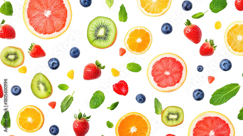 A and colorful arrangement of fresh fruits including grapefruit. kiwi. oranges. strawberries. and blueberries. scattered artistically on a clean white background. ideal for health and wellness themes
