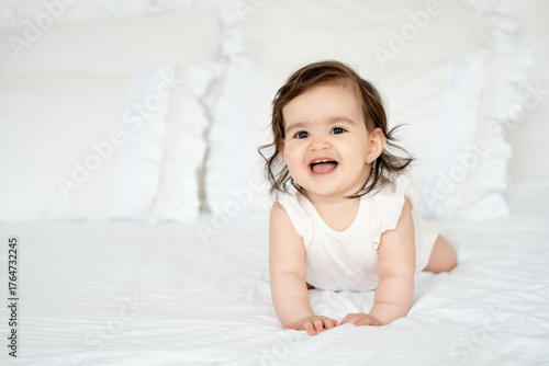 A baby crawls on a white bed at home, a smiling toddler in close-up on the bed