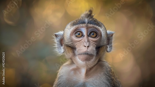 A baby monkey with a messy face and a big, curious look on its face. The monkey is looking directly at the camera, seemingly interested in the photographer