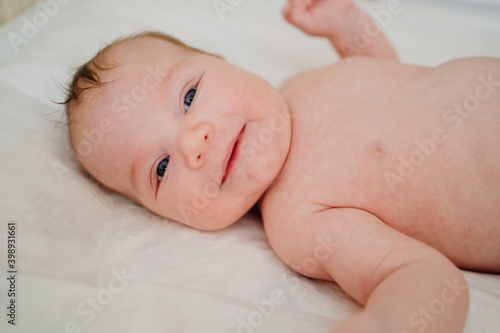 A baby with seborrheic dermatitis on his head rests on a white sheet. childcare.