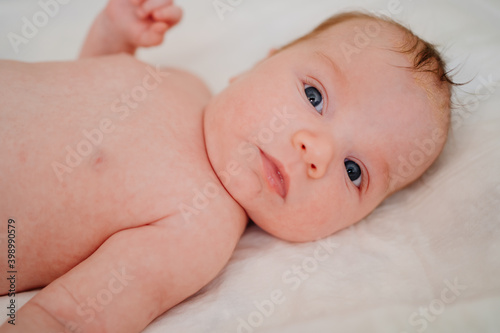 A baby with seborrheic dermatitis on his head rests on a white sheet. childcare.
