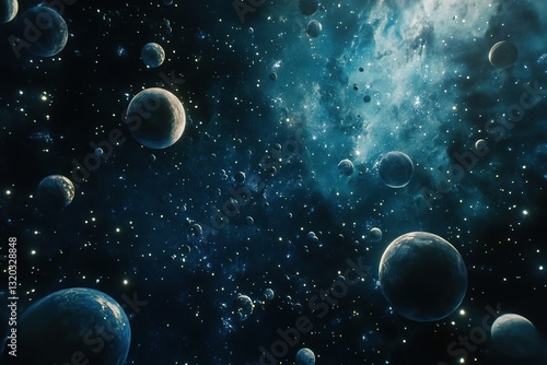 A background drawing depicting a multitude of planets in space. A star field and a nebula in deep space at a distance of many light years from the planet Earth.