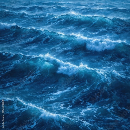 A background of deep blue ocean waves rolling rhythmically, their surface reflecting sunlight