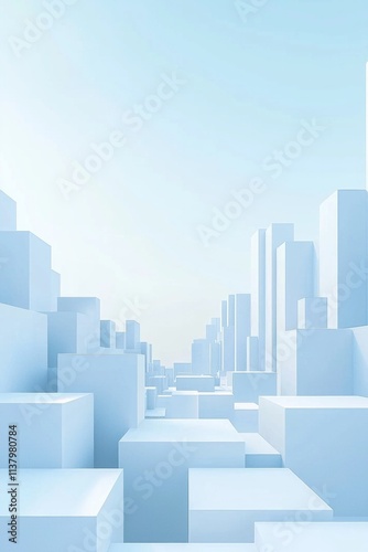 A background of white squares arranged in an urban style, with a clear sky blue as the main color tone. The overall composition is simple and clean, with geometric shapes of various sizes on both side