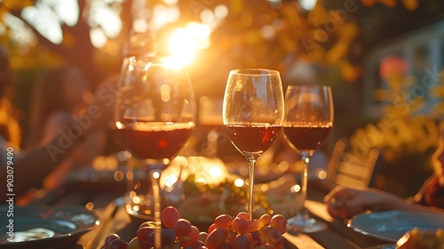 A backyard family gathering, wine glasses raised in a toast, children laughing and running around, a picnic table laden with food, golden rays of the setting sun highlighting the scene, soft shadows.